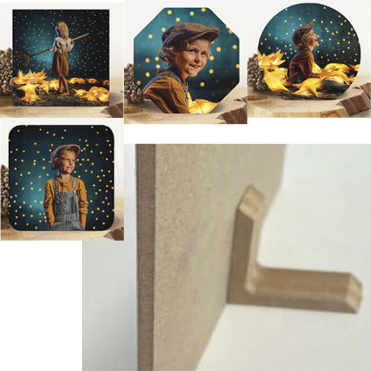 Porta de 5 mm de PVC o de madera de 4mm, con pie para sostenerse. Con 4 formas disponibles.